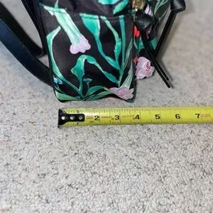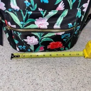 This chic Kate Spade backpack showcases a striking floral design on a black base, highlighted with vibrant red and pink accents. Its compact and stylish form makes it a perfect accessory for any occasion, adding a touch of elegance to your ensemble.