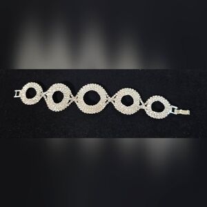 This circle lunks style silver bracelet features dazzling rhinestones.