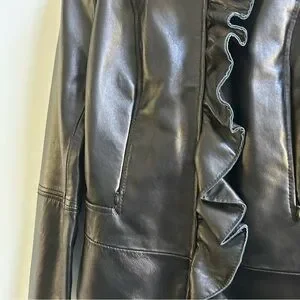 Elevate your style with this chic black leather jacket from Tahari featuring elegant ruffle detailing. Perfect for any occasion!