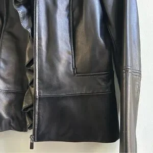 NWT Tahari Perry Women's Black Lamb Leather Ruffled Front Zip Jacket, Size Small
