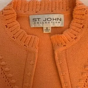 Elegant orange knit sleeveless sheath dress and short Jacket by St. John Collection. Features a textured design and open front Jacket with zipper. Dress size 6 jacket