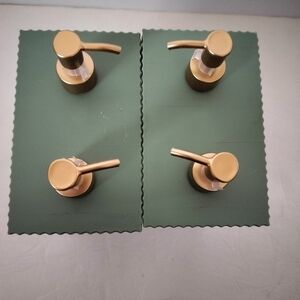Brand new, 2 count dispensers. Can be used in the kitchen, bathroom, laundry room or anywhere throughout the house. Can also be repurposed as a vase to hold artificial flowers. Green color exterior with rustic gold pumps.