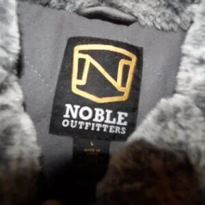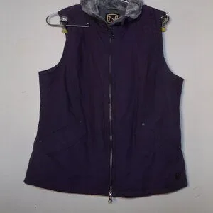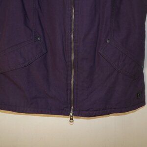 purple duck type Cotton is quilted at shoulders and trimmed upper is faux fur , Zippered center front , snapping side pockets , lined , Shell is 100% Cotton Lining is 100% Polyester , Sz L measurements are roughly 24" from shoulder to hem and pit to pit measures 20.5" ( runs small ) . Good used condition no issues shows minor washing wear. Pet friendly non smoking home