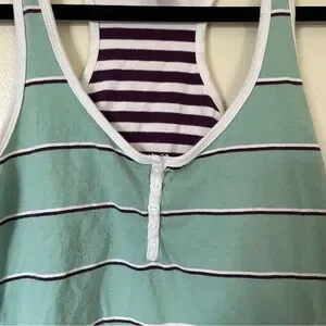 This racerback tank top from Xhilaration features a vibrant blend of green and purple, offering a stylish and eye-catching look. It has a simple color block design, with added stripes and full section of gray on the back and a hint of orange. Three buttons at chest. Lightweight and comfy. Excellent condition. Size small.