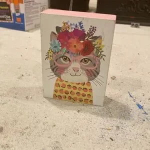 Charming art block featuring a cat with a floral crown. Perfect for adding a whimsical touch to any space.