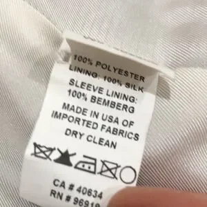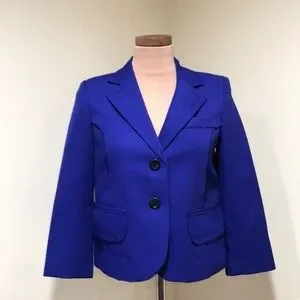 The exterior is in excellent condition no stains rips or fading. There is blue discoloring inside the lining that does not show on the outside. Single breasted, two button closure, notched lapel, fully lined blazer jacket with faux pockets. Not very stretchy.