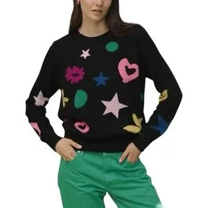 Add a pop of color to your wardrobe with this stylish women's sweater. Featuring a vibrant mix of pink, green, blue, and yellow patterns on a classic black base, this sweater is perfect for any casual outing. Enjoy the comfort and style it brings to your everyday look.