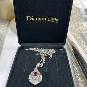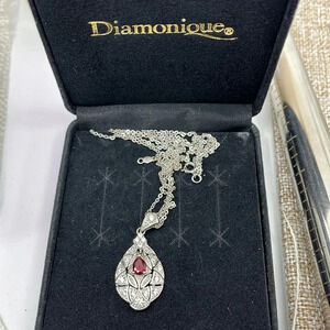 Description: Add a touch of vintage charm to your jewelry collection with this stunning Diamonique necklace from QVC. Crafted in sterling silver with a 925 stamp and made in Sri Lanka, this piece features a deep red garnet-style stone at the center of an intricate pendant design. The chain measures 16 inches and extends to 18 inches with the pendant, making it perfect for any neckline.