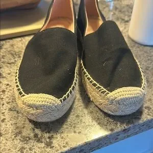 These black espadrilles feature a sleek canvas upper and a classic jute-wrapped sole, offering a stylish and comfortable option for warm weather. The slip-on design ensures easy wear, making them perfect for casual outings.