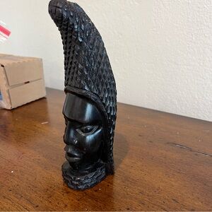 This striking black sculpture showcases stylized features and deep dark brown/black color make it a dramatic addition to any art collection.