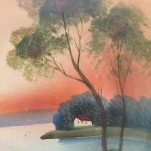 Design: Hand-painted landscape scene with trees, a lake, and a house, featuring gold trim on the handles.