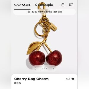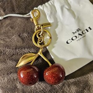 Add a playful touch to your accessories with the Coach Gold and Red Cherry Keychain. Perfect for adding a pop of color to your bag or keys.