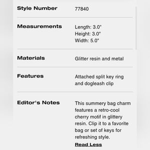 This summery bag charm features a retro-cool cherry motif in glittery resin. Clip it to a favorite bag or set of keys for refreshing style.