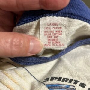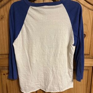 T shirt is 3/4 length sleeves. Good condition. Some wear. Round neck. Single stitch. Measurements are: underarm to underarm is 20 and top of arm to bottom is 25.