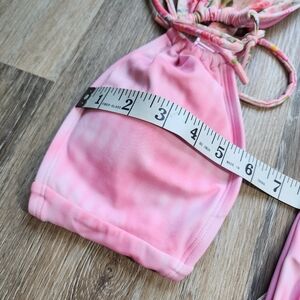 Stylish pink bikini set with floral patterns. Perfect for beach days.