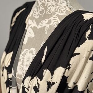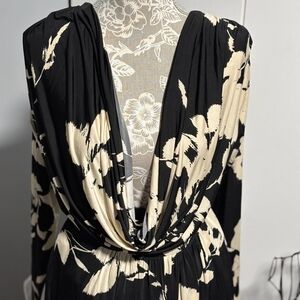This pantsuit features a stunning black and cream design, perfect for any occasion. The top has a deep drop scoop neck and elastic waist. The pants are long and flowing.