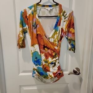 CAbi Womens Crossover Surplice Watercolor Floral Rouched Top Size S