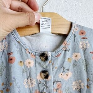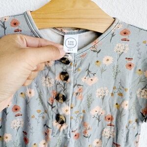 Lou Lou and Company short romper with short sleeves. Buttons at the bottom. Cute light blue romper with floral print. Used a lot so has some wear but lots of life left. Needs steaming. Size 2/3T.