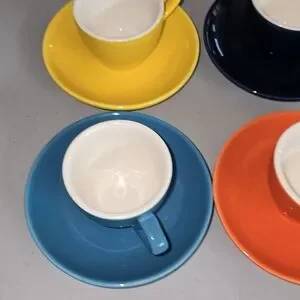 Set of six espresso cups with saucers in bold colors. Includes yellow, navy, white, teal, orange, and light blue. In good pre-owned condition, a bargain at less than $10 per cup and saucer.