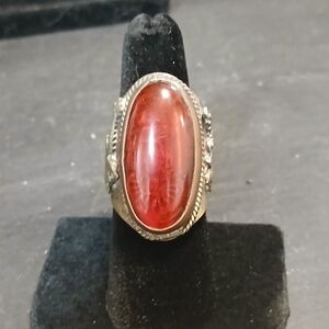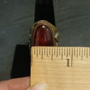 Elegant vintage ring featuring a striking red stone set in a gold tone band. Perfect for adding a touch of sophistication or if your a history hound perfect conversation piece.