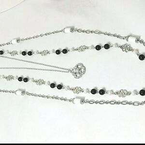 The photos do NOT do this necklace justice! This necklace is actually THREE Detachable Necklaces that can be worn in any combination you wish! Wear only one, wear your choice of two OR Wear all Three!! The Necklaces are Silver toned chains, each with their own unique design that is gorgeous separately or all together!!! The smallest of the three has a beautiful crystal adorned Pendant for added sparkle & and beauty!! This necklace gives you 3 necklaces in 1!! The necklaces could each be worn separately or together as one necklace using the Lia Sophia trademarked infinitme Clasp! You could even get creative and add a third or fourth necklace of different lengths for your own specialized look! Maybe some mixed metal necklaces???? These necklaces are 18-21", 34-37" & 38-41" in length