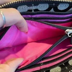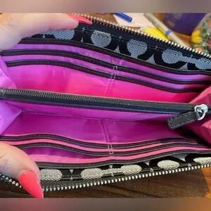 This RARE Coach Poppy leather trimmed monogram wallet features white flowers on the front, a Poppy zipper pull, CLEAN exterior and interior and a gorgeous hot pink interior! The interior has 12 card slots, a zippered coin pocket two large receipt and or bill compartments and then 2 standard bill compartments. The Poppy logo is visible in hot pink against the black leather trim on the inside of this stunning wallet. There is no coin residue on the inside of the zipper compartment, and the edges show no signs of wear, and there is no cracking on the leather. The only callout would be the minor signs of wear on the flowers. Please refer to the pictures.