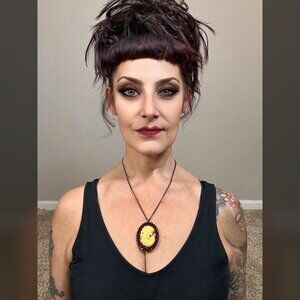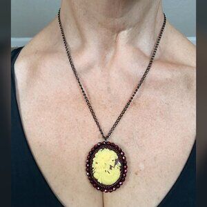 This is a wonderful handmade OOAK gothic cameo in a dark cranberry with dark cranberry rhinestones surrounding the cream colored cameo skull of a victorian countess. This is perfect for any lover of the strange and unusual and would accent any outfit with a hint of dark and macabre. Give yourself a little Wednesday or Morticia Addams style with this. This has a backing of fabric and I'm not sure what the cameo is made of perhaps resin.