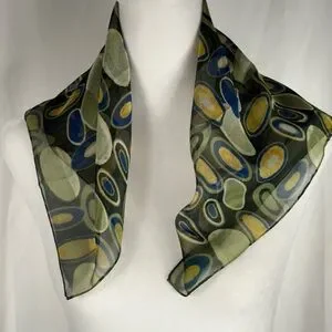 Add a touch of elegance to your outfit with this multicolor scarf. Featuring a blend of green, blue, and gold hues, this accessory is perfect for any occasion. From Elaine Gold. Almost square, 19.5” x 20.5”