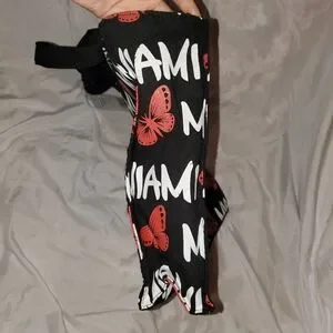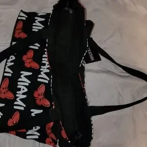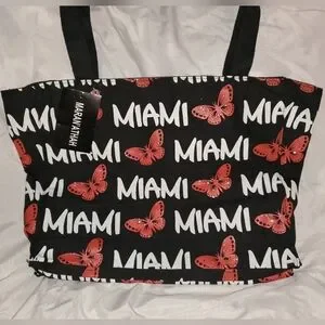 • Canvas tote bag with shoulder straps, zipper closure (though the ends are open), and plastic inner bottom for structure. Has Miami and shimmery butterflies all over. Has one inner pocket on the lining.