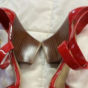 Patent red in great condition. Strapped wedge heel 3.5” with collar back of heel.