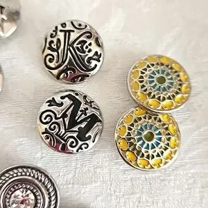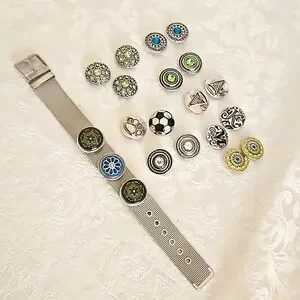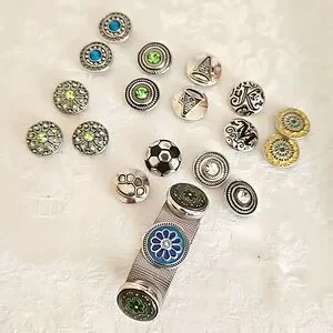 Snaps lot of 19 pieces. Collection includes 1 silver-tone Bracelet and 18 Petite Interchangeable Button Snap Charms.