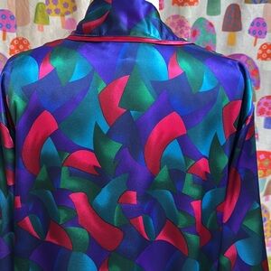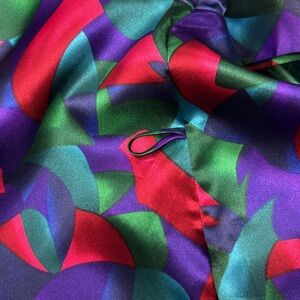 Silky smooth polyester. No size tag. Inside tie. Pockets. Sash. Excellent condition.