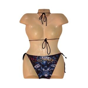 Ed Hardy, Love Kills, Y2K bikini, skull bikini, tattoo print, triangle top, string bikini, side tie bottoms, beachwear, swimwear, micro bikini, rhinestone style, 2000s aesthetic