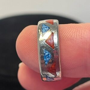 Vintage Navajo sterling silver ring featuring blue Turquoise and red Coral chip Inlay triangles hand crarved silver band. Size 6. As common with vintage native jewelry this is not stamped, but believed to be sterling. Vintage condition with some small scratches.