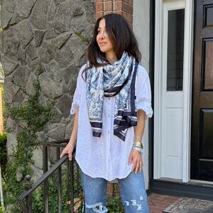 Stylish scarf with intricate blue and white patterns. Perfect for adding a touch of elegance to any outfit.