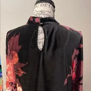 This elegant sheath dress features a sophisticated black base adorned with vibrant red floral patterns, perfect for a wedding guest or cocktail event. The 3/4 sleeves and mock neck add a touch of refinement, while the mandarin collar enhances its chic appeal.