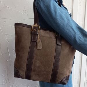 Coach CARLY Suede Shoulder, Tote Bag. Style F10196 Taupe in Color. On the outside-front, has a slip pocket that is convenient. The straps and top & botton edges are lined in a rich brown leather with top stitching. Medium in Size. Brass hardware. The hang tag is also original in suede!!! The outside has normal surface wear, such as a couple small spots, nothing that stands out. It is in beautiful clean condition, I used a suede kit to clean the exterior. Suede is so soft, and I like how it looks varieted in color depending how you brush it in different directions. The interior is lined in a tan fabric, and is in great, clean condition. Interior has a full width zipper pocket with leather creed. Top closure with YKK brass zipper which glides smoothly.