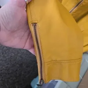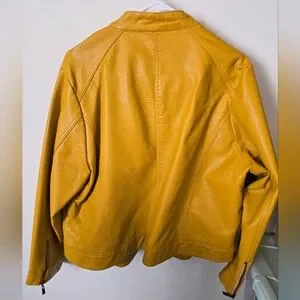 Stylish yellow faux leather moto jacket with zippered pockets and sleeves. Perfect for a bold look. Love this but it doesn't fit my shoulders anymore. Great Condition!! Smoke & Pet free home. Feel free to make an offer.