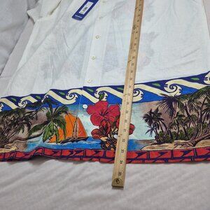 This is a Caribbean men's shirt in size XLT, made of a linen blend material in white color. It features a floral pattern, short sleeves, button closure, collared neckline, and a spread collar style. The shirt is suitable for travel, parties, or casual wear, with a beach, Hawaiian, or tropical theme. It is machine washable and breathable, perfect for summer, fall, or spring seasons, and is adorned with button accents.