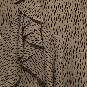 Adorable, new with tags neutral cream and black abstract speckled polka dot print midi skirt by Nasty Gal! High waisted, asymmetric style with side slit, ruffle trim, zip closure, etc.