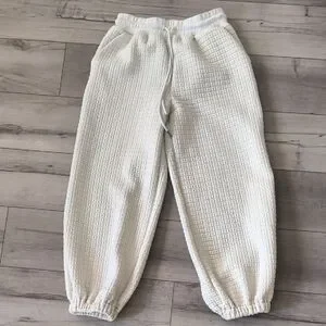 These stylish quilt like pants feature a unique textured design in a classic off white color. Perfect for casual outings or playtime, they offer comfort and style.