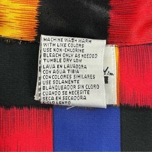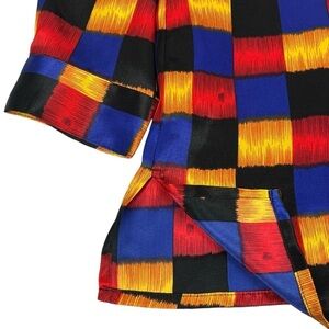 Blue, black, red and gold square print throughout
