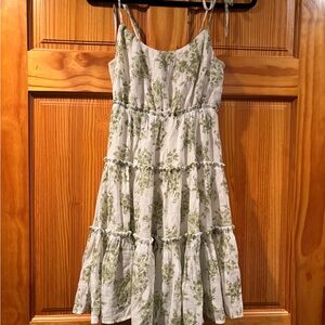 Chic midi dress with green floral pattern. Features adjustable straps and tiered design. Perfect for casual outings.