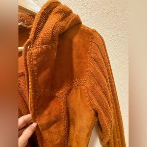 Vintage 1970s Terracotta Leather Suede Knit Crochet Hooded Jacket Coat, Grunge