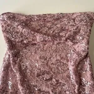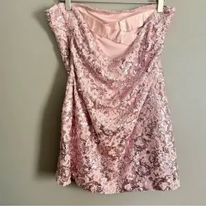 Add effortless embellishment to your next night out with this eye-catching mini, featured in a sequin fabrication and strapless silhouette with crisscross detail at the back and an A-line hem.