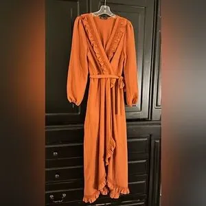 Orange Wrap v-neck ruffle dress with Bishop Sleeves