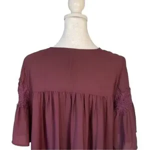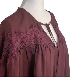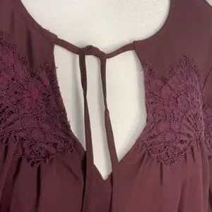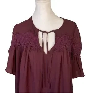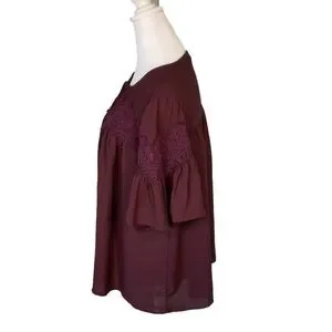 This beautiful blouse from Lucky Brand features flutter sleeves, a tie front detail and distressed lace overlay on the bodice and sleeves. This lightweight blouse could easily go from day to night, from slacks to jeans.