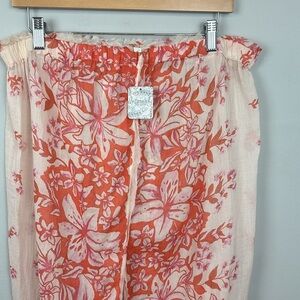 Super lightweight unlined slip skirt coverup withh a front center slip. Light pink with orange flowers. Elasticized waistband.