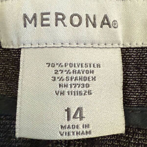 These are pre-owned Merona brand women's pants, size 14. The material is 70% polyester, 27% rayon, and 3% spandex. The pants are gray and feature a wide-leg style with a cuffed hem. They have a button and zipper closure, belt loops, and front pockets. The waist measures approximately 18 inches, and the inseam is approximately 32 inches. There are no visible stains or tears.