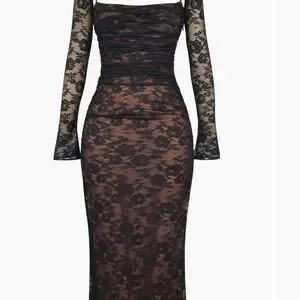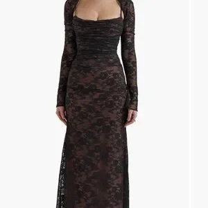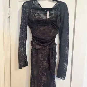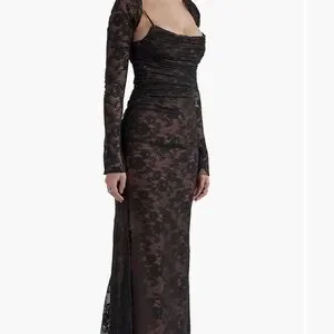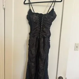 This stunning black lace evening dress is perfect for any formal occasion. Its elegant design and intricate lace detailing make it a standout piece. Ideal for making a sophisticated statement. Worn once. Size is S w/ larger cup size (C/D).